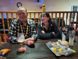 25th April 2025 – Oadby Mayor Charity Night Chair of Blaby pulls faces with Consort Bev Greenwood