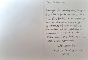 3rd April 2025 – Loughborough Town Hall De Lisle Prize Thank you card to Mayor of Charnwood
