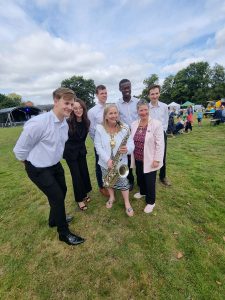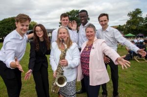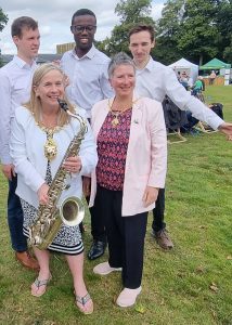 The Mayor of Charnwood Cllr Dr Julie Bradshaw with the Mayoress Julie Ellerbeck and the LSU Tuxedo Swing Band at Music in the Park