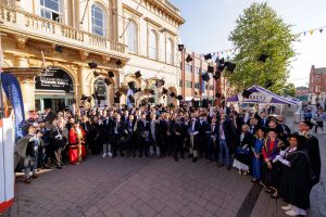18th Sept 2024 Loughborough College Graduation Ceremony Town Hall Group with hats off