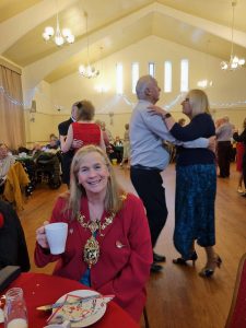 14th Dec 2024 – Christmas Tea Party Mayor enjoying a cuppa with background dancing