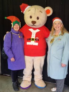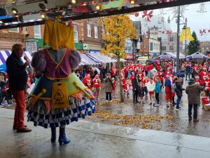 1st Dec 2024 – Santa Fun Run Loughborough for Rainbows Mayor and Mayoress with Bow Bear on stage
