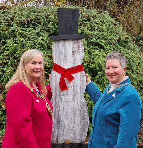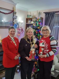 22nd Dec 2024 – Mayor and Mayoress of Charnwood with Fiona Henry presentation of knitted Mayor from Syston K Banxy