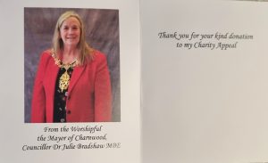 Charity card from Mayor of Charnwood to say thanks to those who donated